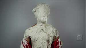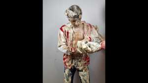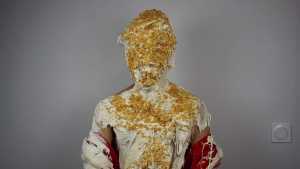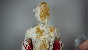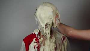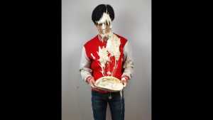 pie after pie, layer after layer, the cute guy is covered with merringue, a nd sometime with other items like cornflakes, cocoa powder, etc...
