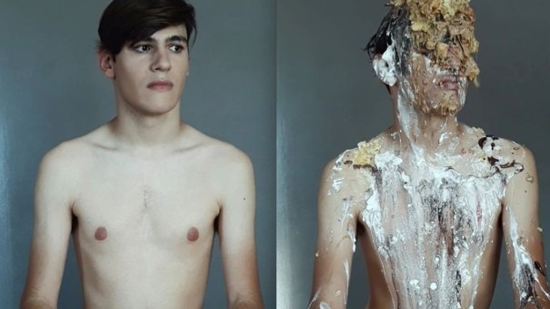 Liquid yogurt is poured on his beautiful hair, to ruin it