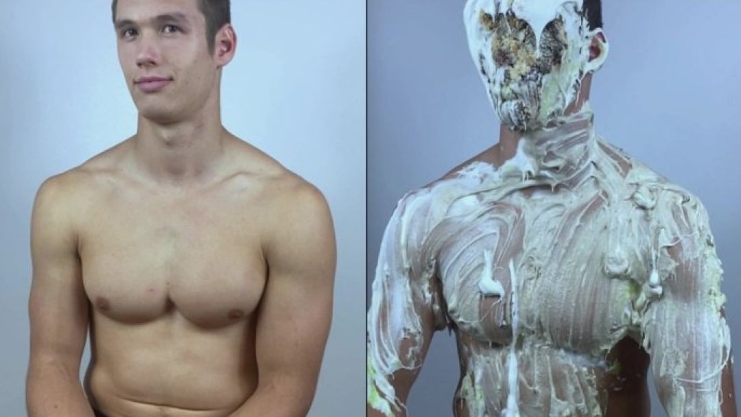 All thi mess is spread all over his body, with a messy massage. and he receives a messy shampoo to ruin his hair!
