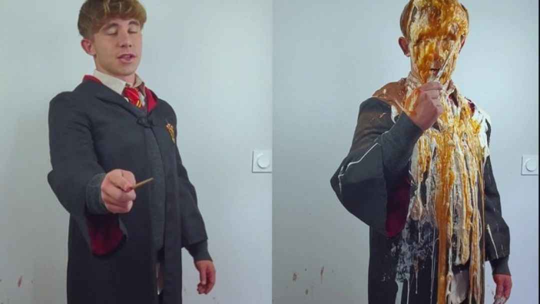 The young wizard is humiliated and covered in sticky and disgusting substances.