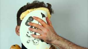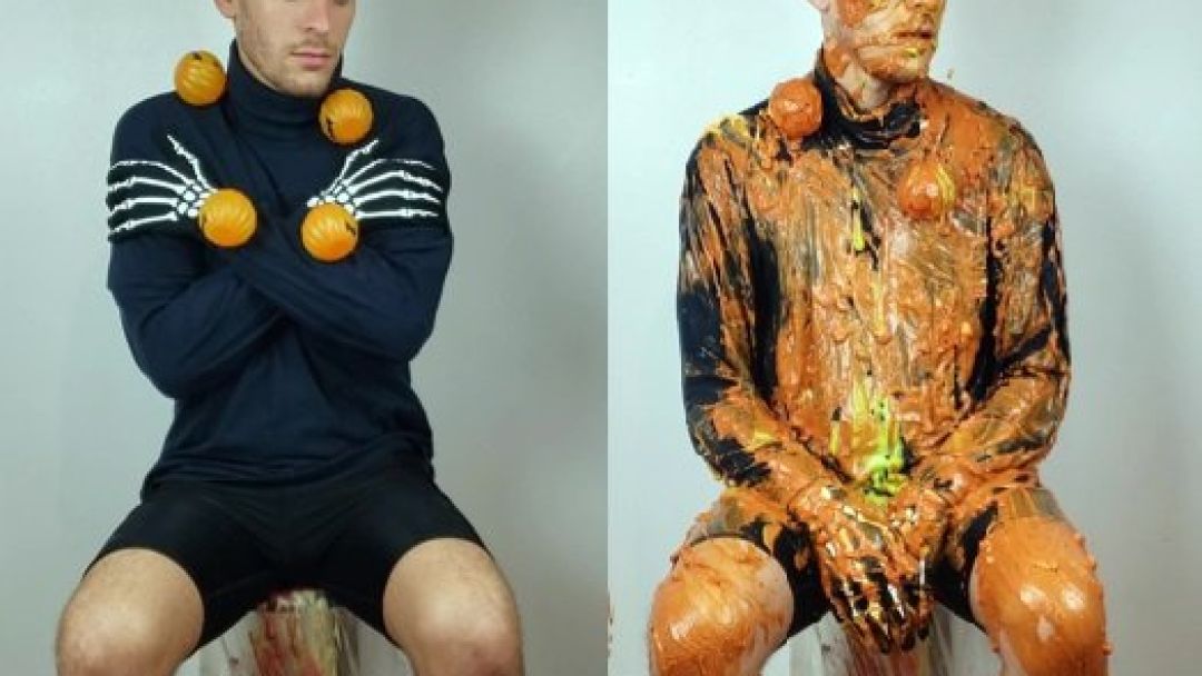 To start the festivities, he receives a Halloween orange cream pie in the face.
