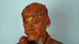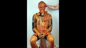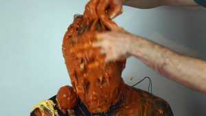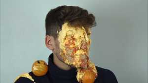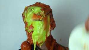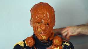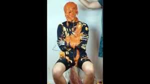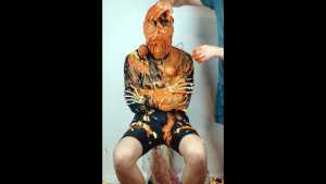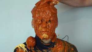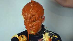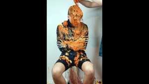 Halloween wouldn't be Halloween without slime! Is face is dunked into a large bowl of orange goo.
