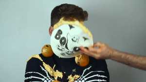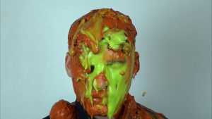 The, spooky green slime is spread on his face.