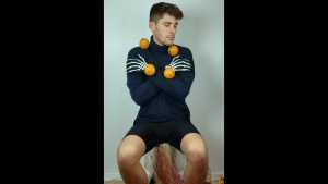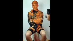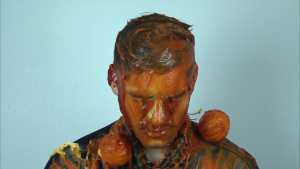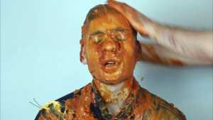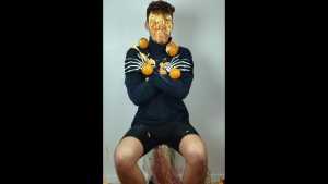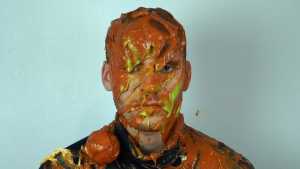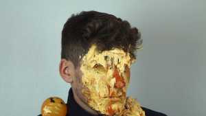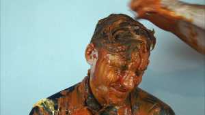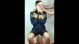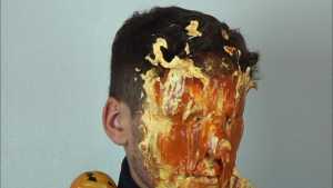 Then a second pie, with orange filling and orange foam, hits him in the face. The cream is also spread on his T-shirt.