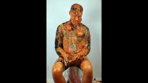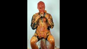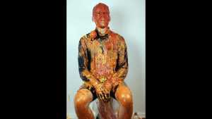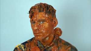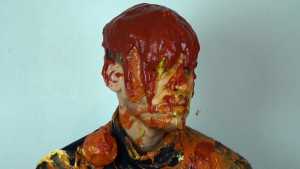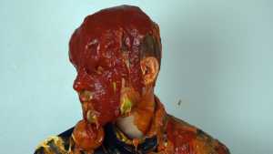 Sauce fake blood (ketchup), is poured all over his hair, and spread on him.